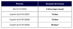 O teto de 20 dias está previsto para entrar em vigor a partir de 1º de janeiro de 2029, condicionado ao cumprimento das metas fiscais estabelecidas pela LDO. Em 2027, a licença passa para 10 dias; em 2028, para 15 dias.